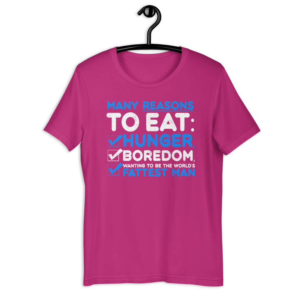 Be the first to review “Many reason to eat: hunger, boredom, wanting to be the world’s fattest man Short-sleeve unisex t-shirt”